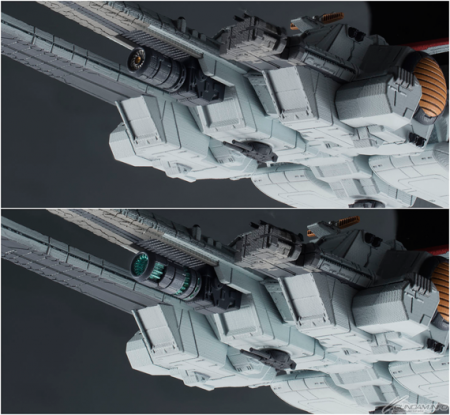 各部分搭載的構造與前作相同,裝備在艦底的「超絕巨型粒子砲」不僅可以用交替零件的方式重現,還可以重現MS格納庫打開的模樣。