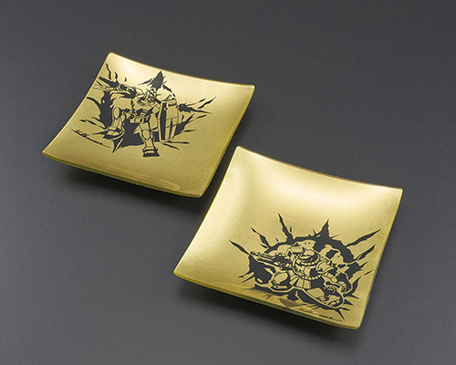 「GUNDAM 金箔玻璃盤」是石川縣・金澤的傳統工藝品「金箔」和機械設計師大河原邦男合作的商品。用風神・雷神的形象所設計,將大河原老師全新繪製的鋼彈和夏亞專用薩克插畫放在金屏風上。