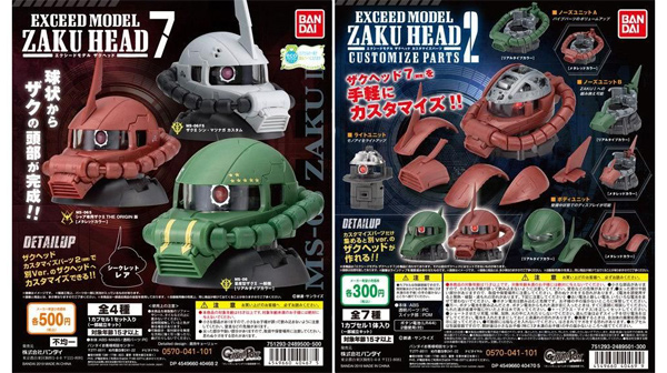 從球狀組裝完成精密MS頭部模型的「機動戰士鋼彈 EXCEED MODEL」系列「ZAKU HEAD 7」和「改裝零件2」,將自10月第1週起依序在日本國內玩具賣場・量販店等處的轉蛋自動販賣機發售。