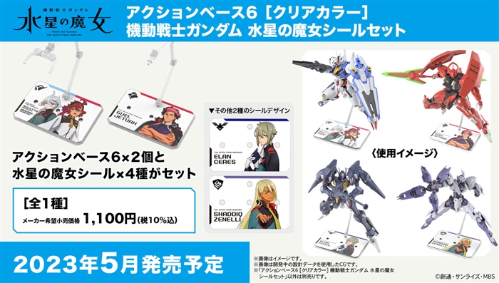 出自『機動戰士鋼彈 水星的魔女』,鋼彈模型(鋼彈的塑膠模型)用「動作底座6[透明彩色]」搭配『水星的魔女』特別貼紙的組合包將於5月發售。價格為1,100日圓(含稅)。