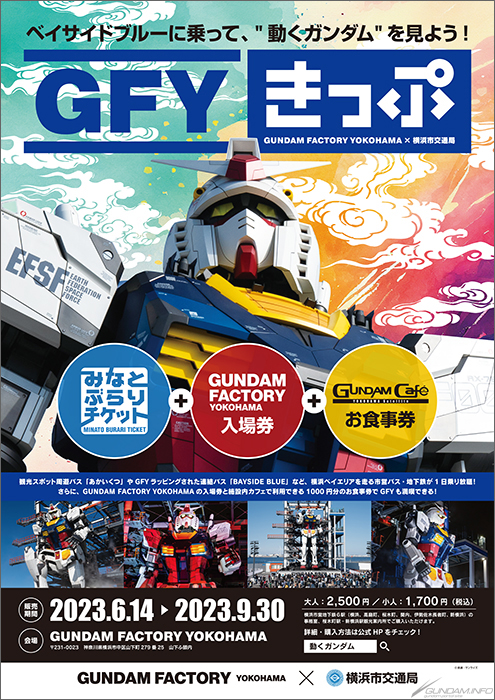 本套票是將能享受到約80間設施・合作商店特典服務的橫濱港埠區市營交通工具1日票「港埠閒逛優惠票」、「GFY入場門票」以及GFY内「GUNDAM Cafè用餐禮券」3種票券成套販售的方便套票。成人2,500日圓(含稅)、孩童1,700日圓(含稅),不管是成人或小孩都會比一般價格優惠650日圓。