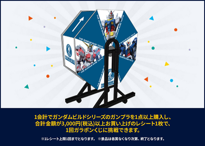 結帳時只要出示購買創鬥者系列鋼彈模型1件以上,合計金額達到3,000日圓(含稅)以上的收據,每張收據可參加一次抽獎。