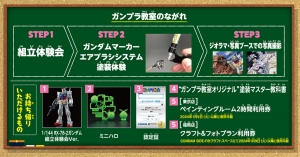 活動將在每天11:00和14:00的兩個場次舉辦。除了組裝體驗會外,還有使用鋼彈麥克筆噴筆系統進行塗裝體驗,還可以再場景・攝影棚拍照。