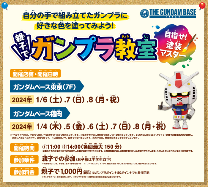 鋼彈基地決定舉辦「親子鋼彈模型教室 目標成為塗裝大師」!東京門市將於1月6日開始,福岡門市將於1月4日開始!