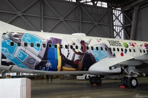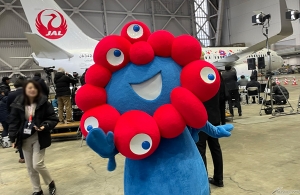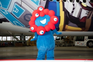 高科表示「這是第3架大阪・關西萬博設計的JAL噴射機。剛開始討論1號機時也有『Myaku Myaku(脈脈)太讓人不舒服畫上去真的沒關係嗎』的意見(笑)。Myaku Myaku(脈脈)最近也增加和各種角色聯名的機會,但還是第一次遇到身高差這麼多的聯名,讓人興奮。距離萬博開幕只剩41天,準備也進入最終階段。我希望能和『JAL鋼彈JET』一起炒熱萬博氣氛」
