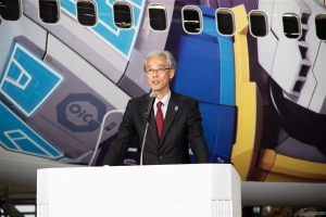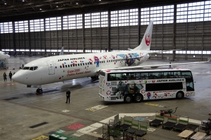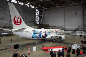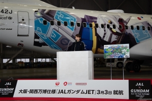 今天3月3日(一)開航的大阪・關西萬博規格「JAL鋼彈JET」,在東京・羽田機場舉行新聞媒體揭幕式。