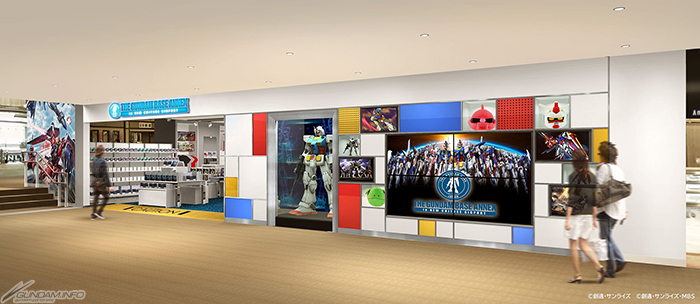 國內線通道將展示1/10比例尺的「RX-78-02 鋼彈(THE ORIGIN Ver.)」立像以及透過多螢幕播放影片外,店内的下牆裝飾齊聚RG鋼彈模型盒繪的設計。
