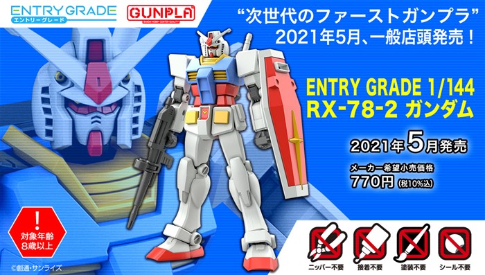 塑膠模型「ENTRY GRADE 鋼彈」將於5月發售,任何人都可以如開心玩遊戲般簡單製作。價格為770日圓(含稅)。
