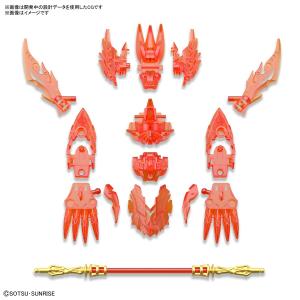 全身使用透明零件,面罩的紅色線條也是使用成形色,單純組裝即可呈現色彩豐富的成品。背後的飛翼與斧頭能夠組合出給另售「曹操飛翼鋼彈」專用的大劍。