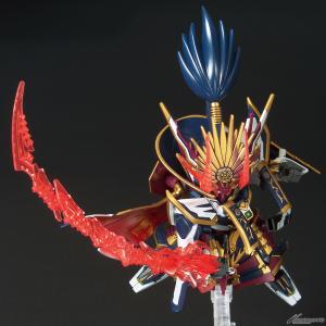 全身使用透明零件,面罩的紅色線條也是使用成形色,單純組裝即可呈現色彩豐富的成品。背後的飛翼與斧頭能夠組合出給另售「曹操飛翼鋼彈」專用的大劍。