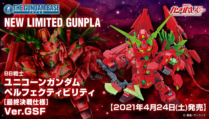 鋼彈模型綜合施設「THE GUNDAM BASE FUKUOKA」(鋼彈福岡基地),在今天4月24日(六),發售了鋼彈福岡基地限定商品「HG 獨角獸鋼彈 PERFECTIBILITY(毀滅模式)(最終決戰規格)Ver.GSF」和「BB戰士 獨角獸鋼彈 PERFECTIBILITY(最終決戰規格)Ver.GSF」。