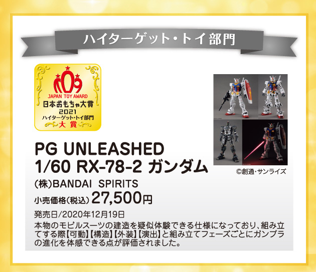 鋼彈模型「PG UNLEASHED 1/60 RX-78-2 鋼彈」榮獲日本玩具協會主辦的「日本玩具大獎2021」高階玩具部門大獎。