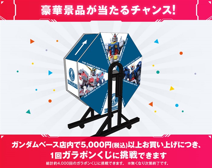 只要在鋼彈基地店内購物達5,000日圓(含稅)以上,就可以挑戰1次「綵球搖獎機」。