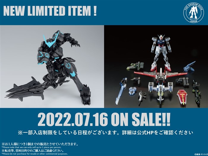 鋼彈模型綜合設施「THE GUNDAM BASE(鋼彈基地)」,決定於7月16日(六)發售鋼彈基地限定品「RG 翔翼型攻擊鋼彈&空中霸者 砲擊型/巨劍型背包 套組[透明配色]」和活動限定商品「MG 獵魔鋼彈[再循環配色/霓虹藍]」。
