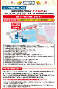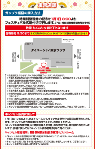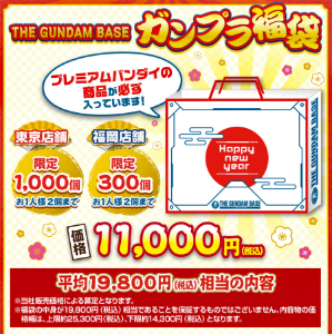 「豪華鋼彈模型福袋」(含稅11,000日圓)內容物包含PREMIUM BANDAI商品等等平均價值19,800日圓(含稅),限量登場。關於購買方式,將會在元旦8:00起於「節慶廣場」附近發放各時段號碼牌。