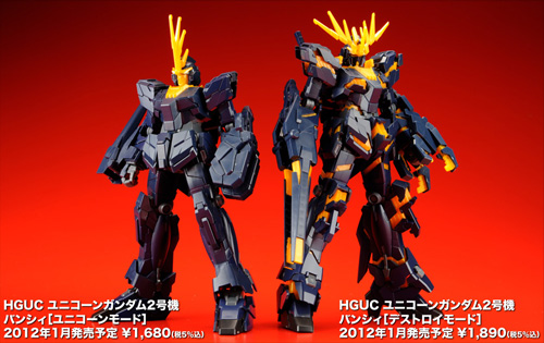 「HGUC獨角獸鋼彈2號機 報喪女妖」有「獨角獸模式」和「毀滅模式」等2種類發售,價格方面,獨角獸模式是1,680日圓(含稅)、毀滅模式是 1,890日圓(含稅)。兩者都預定在2012年1月發售。「HGUC 裘亞凱」在價格以及發售日上都還未確定。