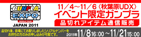 在月初舉辦的鋼普拉盛會「GUNPLA EXPO WORLD TOUR JAPAN 2011」,在會場所販售的活動限定鋼彈模型中,於展期完售商品的網路通販將在Premium BANDAI・Hobby網路商店中販售至 11月21日(一)15:00止。