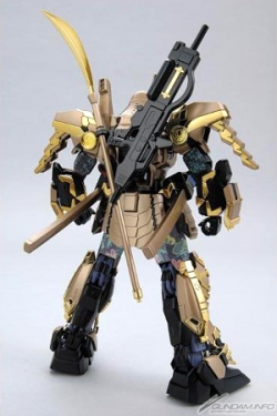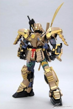 「MG 武者鋼彈Mk-II 德川家康版」以德川家康裝飾初次上戰場時使用的盔甲『金陀美具足』為形象的樣式,由電鍍加工零件與特殊素材「和風原創貼紙」重現過往所沒有的厚重感與輝煌感的輪廓。