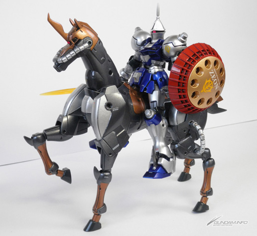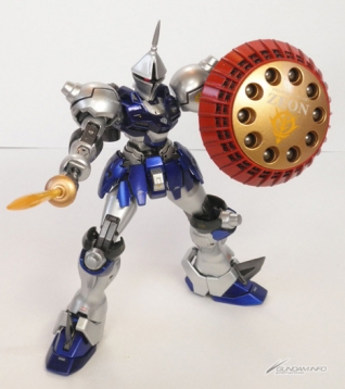 這是一台將本來就擁有優異格鬥性能的甘恩再強化的機體!藉由MH(Mobile Horse)產生的高速戰法,表現出一騎當千的強大。武器只有光束軍刀和飛彈盾。但是以其超群的機動性,根本不會讓敵人碰到一根汗毛。靠著想讓ZIMMAD公司的MS更加活躍,這種如火燃燒般的熱情化為形體的鋼彈模型。這種想法在戰鬥中所引導出來的就是無敵強大。全身使用金屬塗裝、將會被人以「銀色的流星」稱號聞名於世!