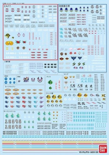 「鋼彈貼紙DX」第3彈“SEED系”登場! 軍隊標誌、部隊標誌、數字標誌、線印記等重視泛用性所構成,還有一部分採用銀色標誌,更增加用途的“豪華”商品。推薦對應比例1/144。
