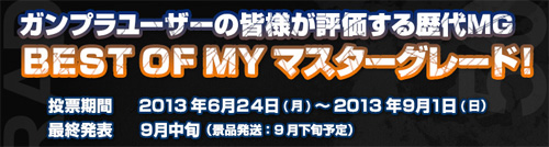 為了紀念在8月要發售「MG RX-78-2鋼彈Ver.3.0」而舉辦的「歷代MASTER GRADE人氣投票」,要由玩家們來決定共有170品項的MASTER GRADE商品中前50名。