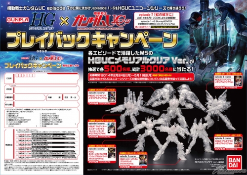 本活動中,只要將附在指定商品組裝說明書內的印花1張,貼在店家宣傳單上附屬的專用申請明信片,或是標準明信片上,並寫上必要事項寄回,就有機會抽中在episode 1到episode 6的每一話當中活躍的各MS「HGUC 紀念透明Ver.」。每一台機體都將抽出500個名額,總計送出3,000份好禮。