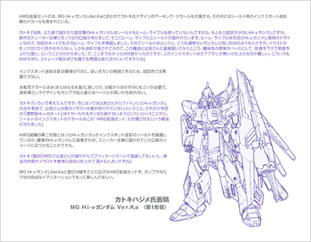 訪談中談論到「Hi-ν鋼彈」為什麼會裝上原本是「ν鋼彈」裝備的HWS(重武裝系統)的理由、以及設計時的目標、模型的賣點等等,內容相當豐富。