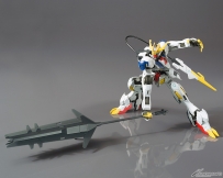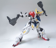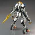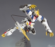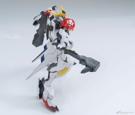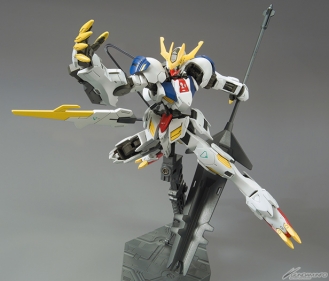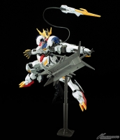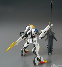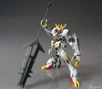 『機動戰士鋼彈 鐵血孤兒』第2季中的新主角機「天狼王型獵魔鋼彈」於HG最速立體化!以全新的零件忠實地再現巨大的前腕部、和如同野獸般的頭部天線造型!腕部内藏的機械臂也可以展開,分離式的背部武裝可以透過鐵絲再現攻撃狀態!也附屬了握柄可伸縮的超大型鎚矛!