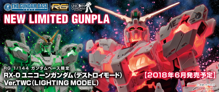 這次公開的有「RG 鋼彈基地限定 獨角獸鋼彈(毀滅模式)Ver.TWC[LIGHTING MODEL]」、「HG 鋼彈基地限定 獨角獸鋼彈(毀滅模式)[PAINTING MODEL]」2款。