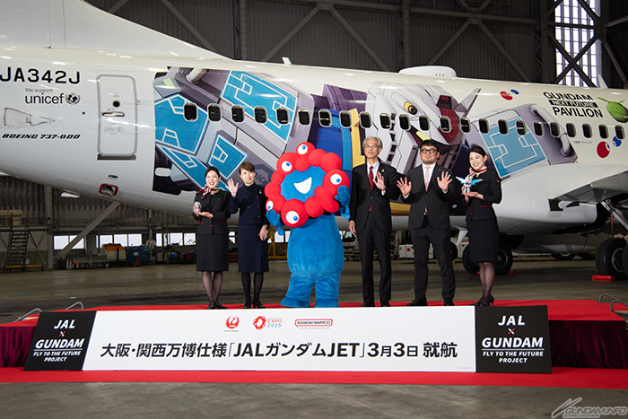 高科表示「這是第3架大阪・關西萬博設計的JAL噴射機。剛開始討論1號機時也有『Myaku Myaku(脈脈)太讓人不舒服畫上去真的沒關係嗎』的意見(笑)。Myaku Myaku(脈脈)最近也增加和各種角色聯名的機會,但還是第一次遇到身高差這麼多的聯名,讓人興奮。距離萬博開幕只剩41天,準備也進入最終階段。我希望能和『JAL鋼彈JET』一起炒熱萬博氣氛」