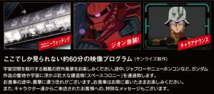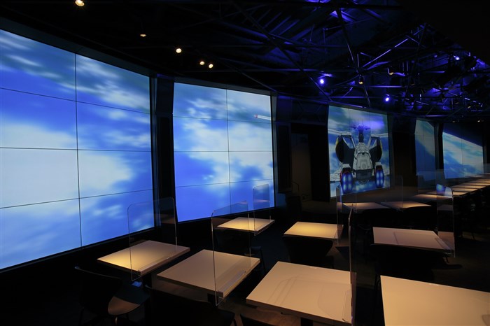 讓人聯想到戰艦窗戶,全長18m的大型多重螢幕,會放映在宇宙空間飛行的MS等事物,可以享受到宛如在宇宙戰艦内用餐的投入感。