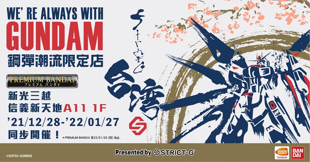 鋼彈迷們注意!今年跨年就讓從日本空運來台、專屬於台灣鋼彈迷的限定商品一同迎接2022年的到來!台灣萬代南夢宮為回饋鋼彈迷的支持,將於2021年12月28日起至2022年1月27日,於新光三越台北信義新天地A11館1F,擴大舉辦將近一個月的「鋼彈潮流限定店WE'RE ALWAYS WITH GUNDAM」活動。限量限時販售,喜愛鋼彈或潮牌服飾的朋友可把握時間至「鋼彈潮流限定店」朝聖。