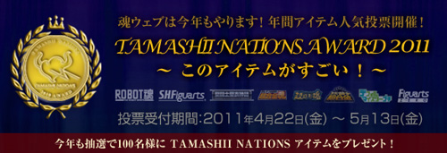 BANDAI Collectors事業2010年度以來所發售的商品當中決定出最佳商品,而舉辦的問卷投票活動「這個商品最厲害!~TAMASHII NATIONS AWARD2011~」正在魂web進行中。
