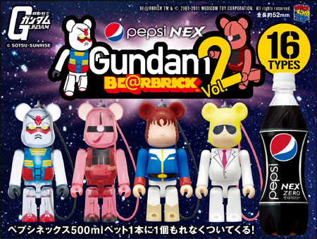 本活動是由「機動戰士鋼彈」和「百事NEX」的共同合作,以鋼彈系列當中受到歡迎的MS以及角色為基底而製作出全部共16種的 「BE@RBRICK」,每個500ml百事NEX 寶特瓶裝皆附贈1個。而本次的 第2彈則新增加「吉翁克」、「薩克雷洛」、「拉拉・遜」等新商品登場。