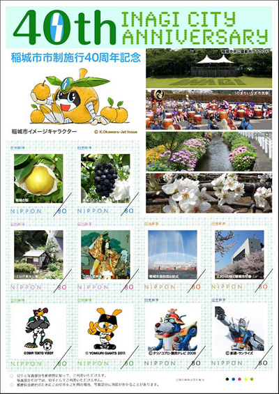 「市制施行40周年紀念郵票」除了大河原先生親手設計的「鋼彈」和「狗俠汪汪」等角色的圖樣外,繪有稻城市風景和農産品等圖樣的限量郵票,也正於市内郵局限量1,500套發售中。