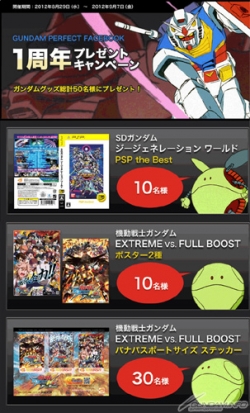 由NAMCO BANDAI GAMES營運的Facebook粉絲頁「官方GUNDAM PERFECT FB」與「NAMCO BANDAI GAMES」,為了紀念各自開設1周年, 從8月29日(三)至9月7日(五),實施期間限定的豪華獎品特別活動。