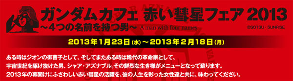 於東京・秋葉原營業中的鋼彈官方餐廳「GUNDAM Café 秋葉原店」,從今天1月23日(三)起「紅色彗星博覽會2013 ~擁有4個名字的男人~」活動開跑。