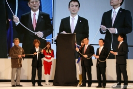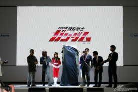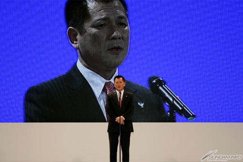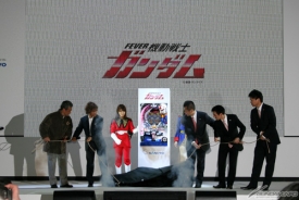 首先是股份有限公司SANKYO的常務執行主管營業本部長・富山一郎先生的致詞,他 意氣風發的表示,本回發表的「FEVER 機戰士鋼彈」是與創通、SUNRISE、以及目前為止經手過許多鋼彈遊戲製作的NAMCO BANDAI全面協力之下,採用全3DCG並進行專用機台的開發,是最高水準的機台;並透過鋼彈這個具有廣泛認知性的作品,讓全國上下染上一片鋼彈的色 彩。
