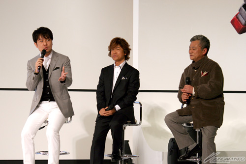 揭開機台之後,大家都很熟悉的「鋼彈藝人」土田晃之先生也參加了脫口秀。首先,問到了鋼彈的魅力,古谷先生說到『富野監督所製作的世界觀、有個性的聲優、還有帥氣的MS吧』,池田回答『聯邦與吉翁,宇宙殖民地居民的想法、人們生活的方式與人性的描寫非常的棒』。