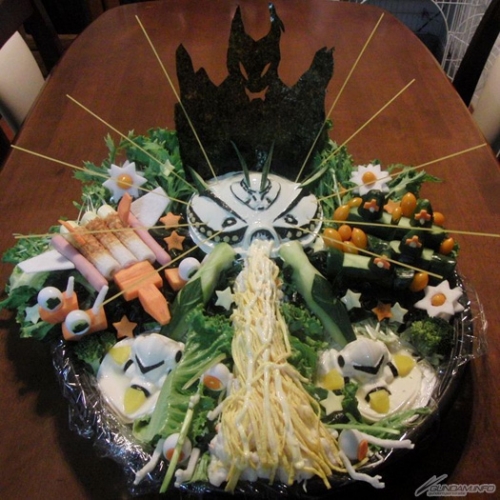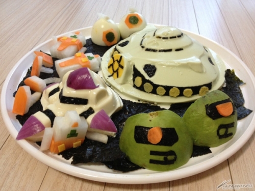 利用蛋和蘿蔔等蔬菜表現屍橫遍野的聯邦軍量產型,支援畢格・薩姆英勇姿態的薩姆則用酪梨來表現!