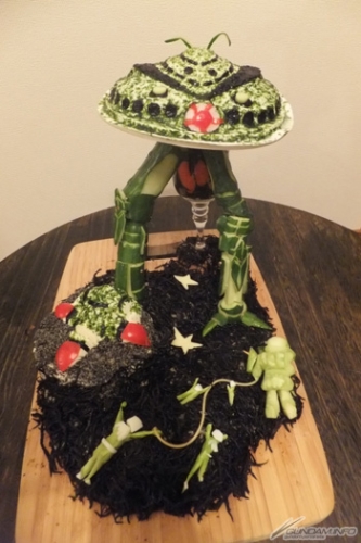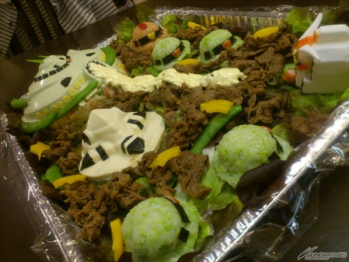 我用飯來重現了這個畫面(笑)。為了配合畢格・薩姆豆腐的質感而採用小黃瓜製作腳部,其中一腳的豆腐部分灑上了像是所羅門岩石的芝麻、作成芝麻豆腐。頭部的豆腐灑上綠海苔、支撐的玻璃杯裡則放入蟹肉棒重現噴射器。連結薩克的士兵們和薩克是花椰菜和麵。 接下來底座,以羊栖菜飯重現所羅門的岩石表面。。。