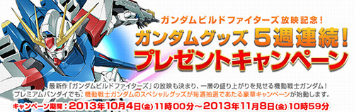 第1週將於10月4日(五)11:00至10月11日(五)10:59之間實施,從參加者中抽出5名贈送「HG 全裝備型製作攻擊鋼彈」和「HG 驚異薩克」一組。接著第2週,將於10月11日(五)至18日(五)實施,得獎者可以獲得「FW GUNDAM CONVERGE SP03」。再下來的每週獎品預定會陸續發表。