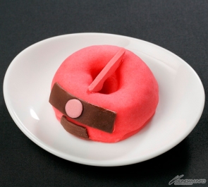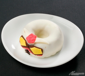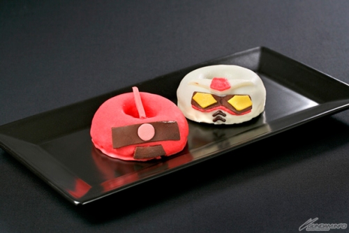 整體覆上白巧克力的「鋼彈」,經典重現雙眼攝影機及V字天線。紅色甜甜圈「夏亞薩克」則裹上草莓口味的巧克力,同時也忠實重現了單眼攝影機及代表性的刃型天線。