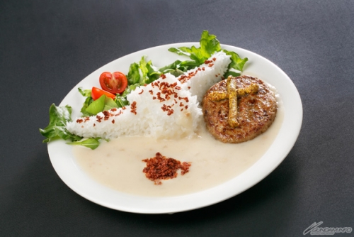 ガンダムのV字アンテナを模した「ビルドストライクライス」と、純白の装甲をイメージした「カルボナーラソース」、シールドをイメージした「シールドハンバーグ」のセット。