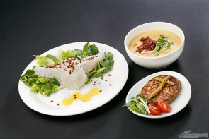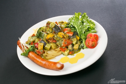 イタリア代表リカルド・フェリーニの愛機をイメージしたプレートはパスタをメインに構成。「フェニーチェパスタ」、「ジェノベーゼソース」、「ビームレイピアソーセージ」のセット。