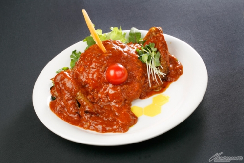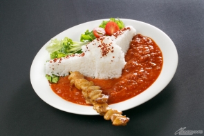 全てが赤系の色で統一された深紅の一皿。「ザクヘッドライス」と「ミートソース」、「人手羽ナタ」のセット。