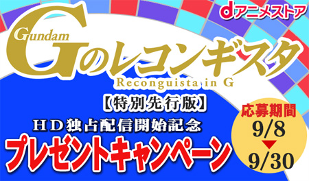 DOCOMO的動畫影片看到爽服務「d動畫商店」,為了紀念『鋼彈 RECONGUISTA IN G』特別搶先版HD獨家上架,自今天9月8日(一)起開始舉辦記念大放送活動。