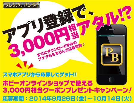 活動期間,只要下載PREMIUM BANDAI官方APP,並在我的收藏設定中開啟「HOBBY ONLINE SHOP」為“ON”,就可以到廣告橫幅參加抽獎,獎品是可以在「HOBBY ONLINE SHOP」使用的3,000日圓等值折價券,共將抽出300個名額。