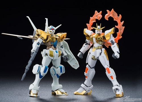 這次發表的是「合作活動主宣傳圖」,上面畫著2架金光閃耀的兩作品主角機;而鋼彈模型套組的顏色也是跟宣傳塗相同的「RISE!配色版」!