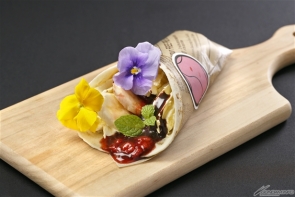 ■將草莓、香蕉、奶油、巧克力醬以墨西哥薄餅美麗的包起來,散發出春天氣息的的單手甜點。